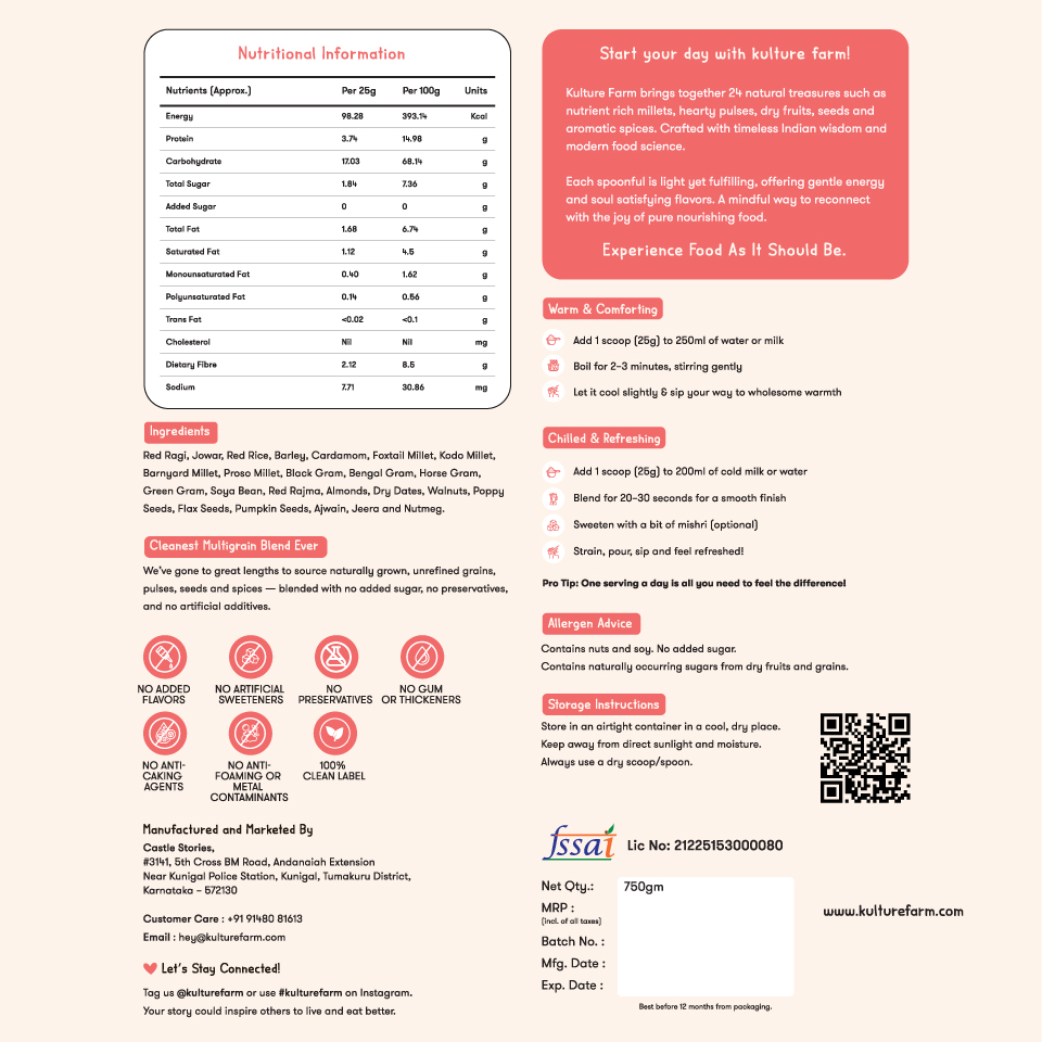 Kulture Farm Multigrain Healthmix is a thoughtfully crafted blend of 24 natural ingredients, bringing together nutrient-rich millets, grains, pulses, nuts, seeds, and aromatic spices. Made using timeless Indian wisdom and modern food science, each spoonful is light, filling, and designed to support everyday wellness for all age groups.